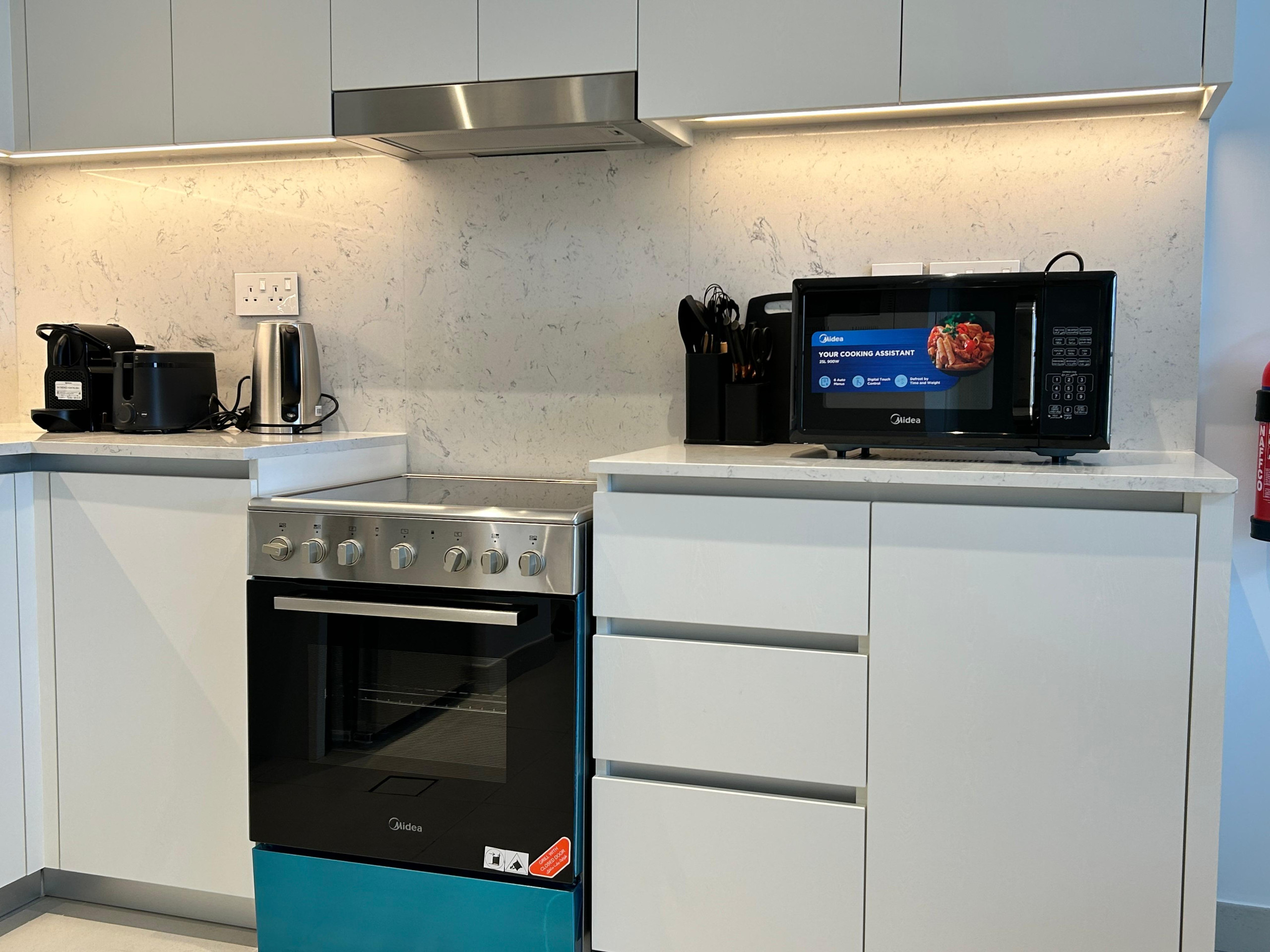 Fully Equipped Kitchenette featuring an oven, cooking pot, plates, spoons, and all the essentials to make your meals with ease